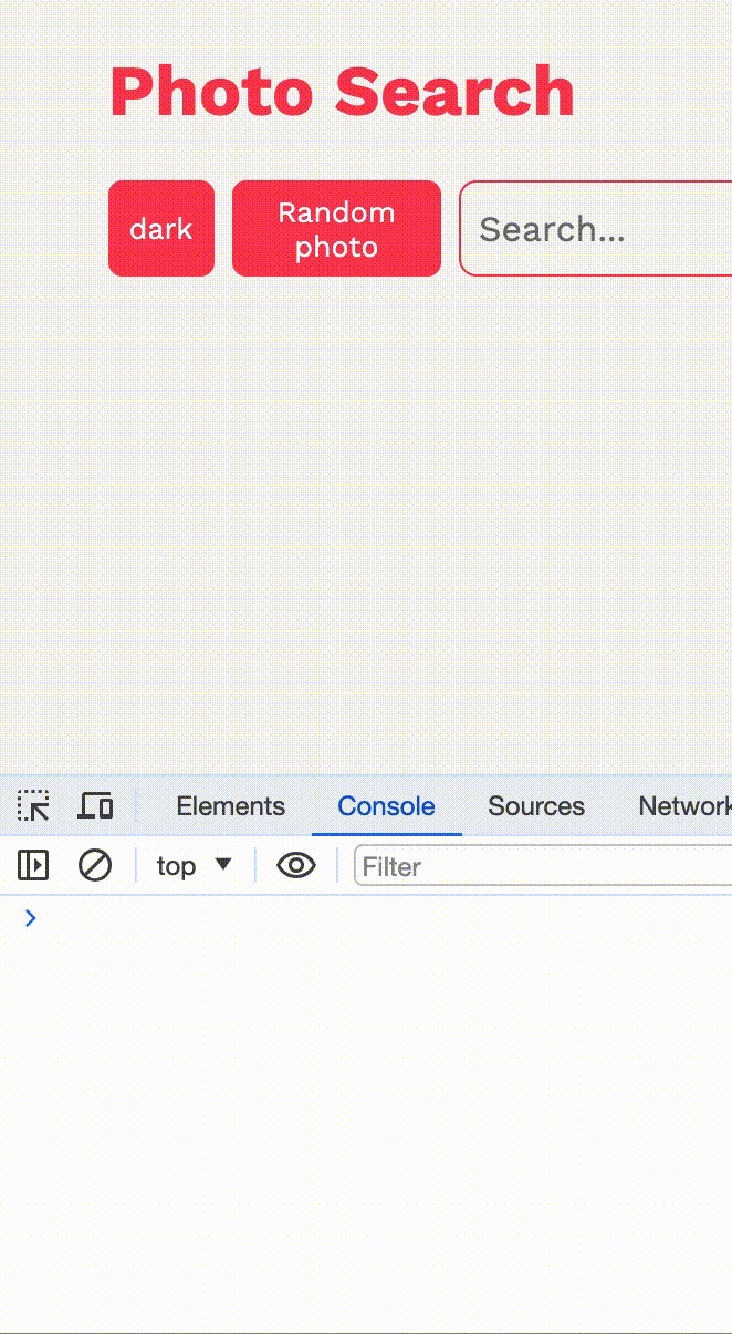 App에서 각각의 컴포넌트를 관리하는데, 이때 App은 고유의 state(error, visible, image, data, keywords)를 가지고 있다. data는 말 그대로 사진 데이터를 말한다. API로 요청을 보내면 랜덤 사진의 경우 하나의 사진 데이터를 보내주고, 키워드로 검색할 경우 여러개의 사진 데이터를 보내준다. keywords는 검색한 키워드의 배열인데 최대 5개까지만 저장한다. image와 visible은 사진 모달 때문에 필요한 state인데, image에는 말 그대로 클릭한 모달의 사진 데이터가 들어 있고 visible은 모달이 보여지는지 여부를 담는다. error는 검색 결과가 없을 때 true가 되도록 설정했다.(화면에는 no results. 처럼 표시된다.)